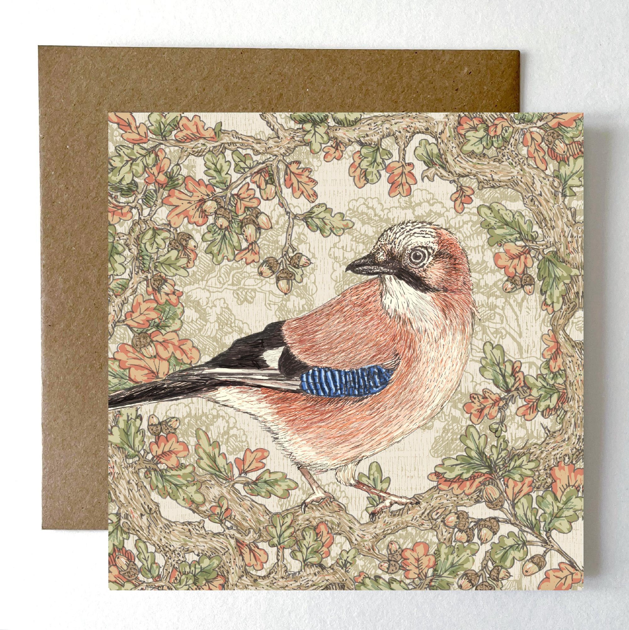 A Jay sits amongst oak leaves and acorns . Inspired by the beauty of the British Countryside thisi hand drawn Jay is from an original artwork capturing the spirit of nature in the forest of Bowland.